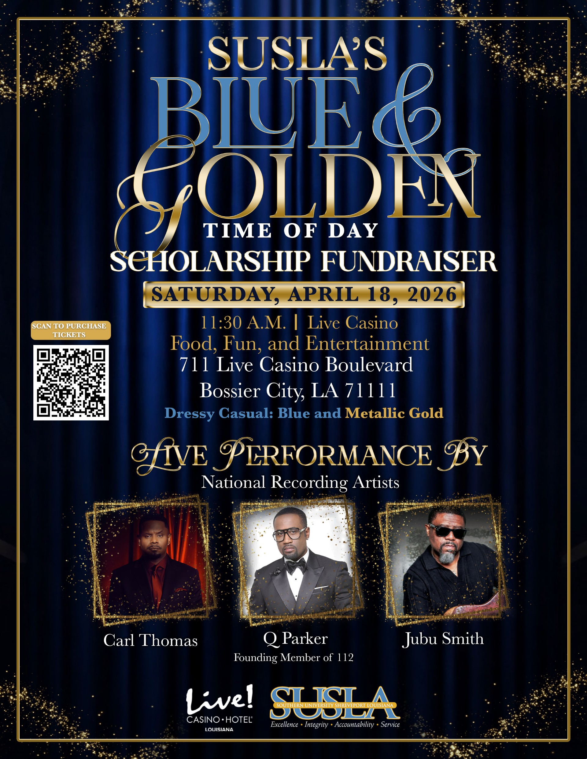 We are pleased to announce SUSLA's Blue & Golden Time of Day Fundraiser on Saturday, April 18, 2026, at 11:30 AM at Live Casino, located at 711 Live Casino Boulevard, Bossier City, LA 71111.