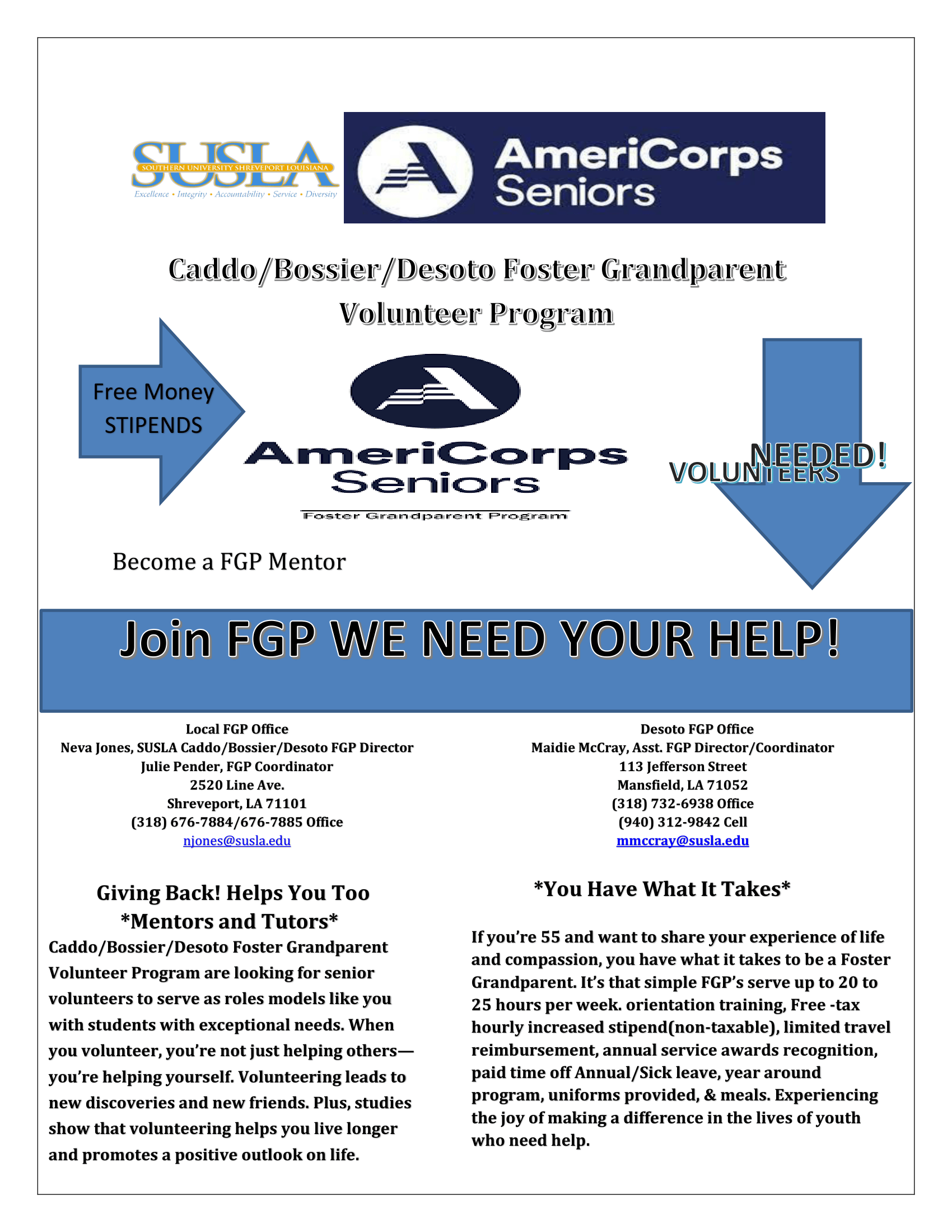 Through the SUSLA AmeriCorps Seniors Caddo/Bossier/Desoto Foster Grandparent Volunteer Programs serving as tutors and mentors providing needed strong, consistent relationships with caring adults that help build confidence and life skills with youth. They need extra love, nurturing, and understanding. The AmeriCorps Seniors Caddo/Bossier/Desoto Foster Grandparent Volunteer Programs at volunteer serving as a Foster Grandparent, fill the gap, bringing children in need together with seniors in a mutually beneficial experience. Although the Caddo/Bossier Foster Grandparent Program has operated in Shreveport/Bossier since 1971980, Southern University-Shreveport has been the sponsor since July 1, 2021, and now serves in DeSoto Parish as well.